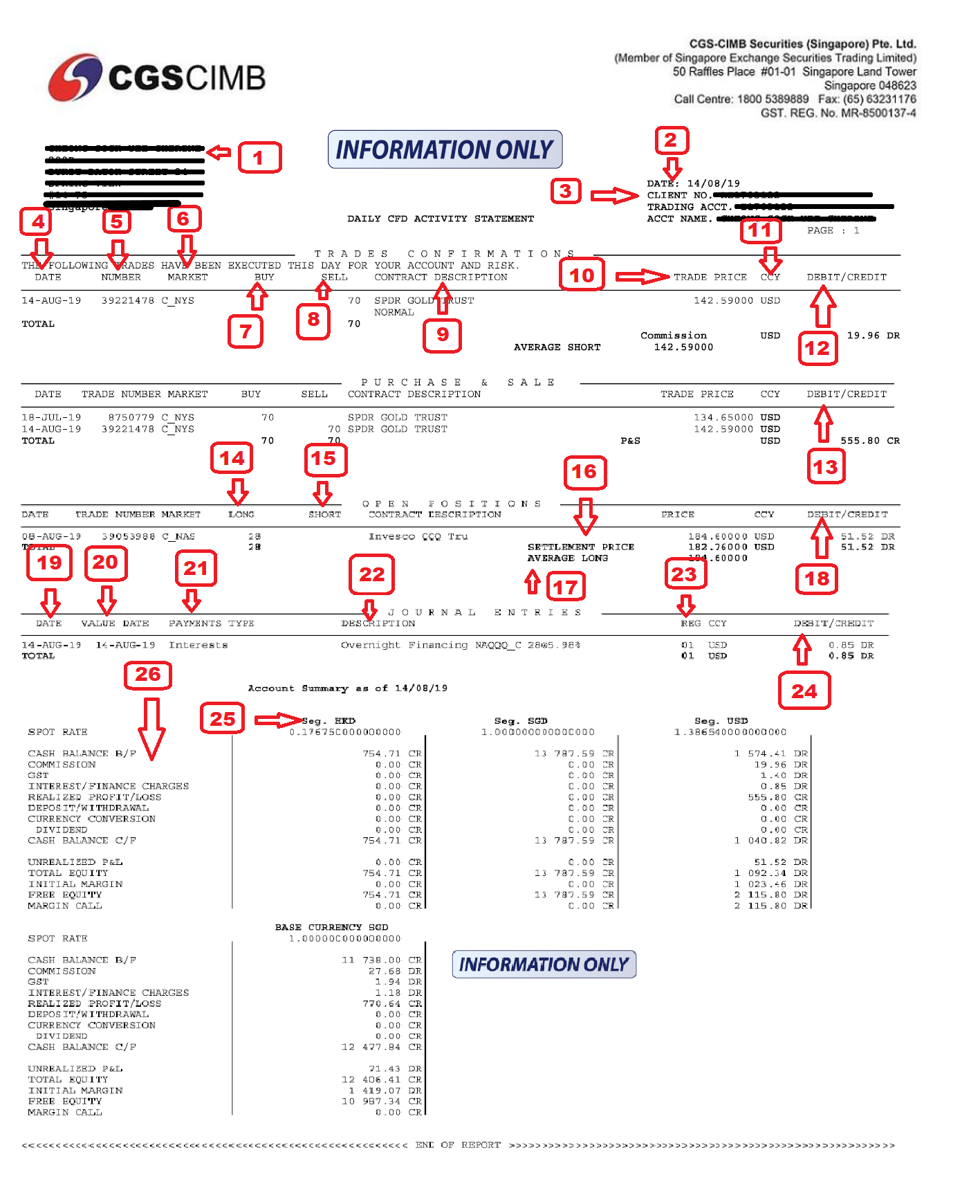 | Cash Balance C/F | Cash Balance carried forward for last business day Cash balance c/f = Cash balance b/f + Commission + GST + Interest + Realised P&L + Deposit/Withdrawals |
